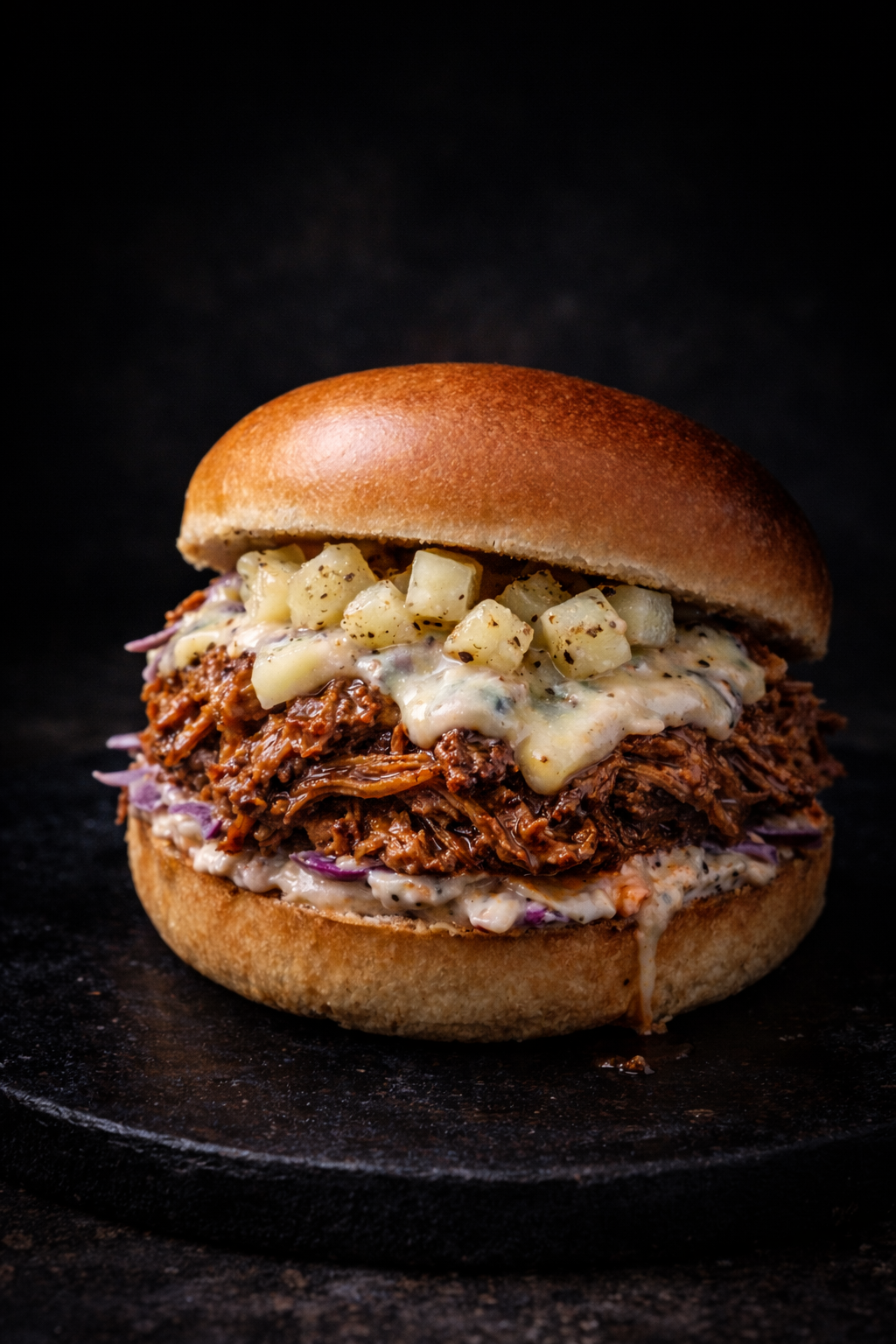 Bun’s artisanal Label Rouge, Effiloché de porc maison né & élevé & abbatu en bretagne confit dans notre sauce Barbecue, colslaw chou carotte maison, pickles de pommes à la cardamome. (Photographie non contractuelle).