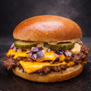 Buns artisanal Laurent Maeseele, sauce barbecue maison, boeuf breton racé finistérien x 2, poitrine de porc double dose, pickles de concombre maison, Cheddar maturé et tomme d’Auvergne, oignons frits.