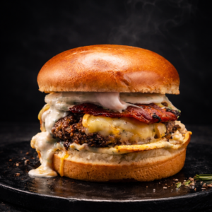 Bun artisanal, sce barbecue maison, poitrine de porc délicatement grillée, tomme grise d’Auvergne, poulet breton pané maison, roquette sauvage.
